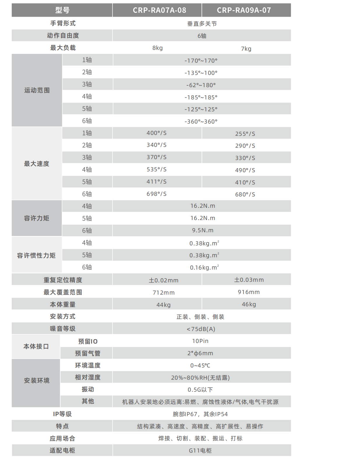 • 臂长712mm,手腕负载容量大,额定负载8kg,可轻松应对多种应用场合。